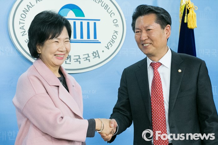 (서울=포커스뉴스) 손혜원(왼쪽) 더불어민주당 홍보위원장이 18일 오후 서울 여의도 국회 정론관에서 출마 기자회견을 마친 뒤, 정청래 의원과 악수하고 있다. 한편, 손 위원장이 출마하게 될 서울 마포을 지역구는 공천 배제 된 정 의원 지역구이다.
