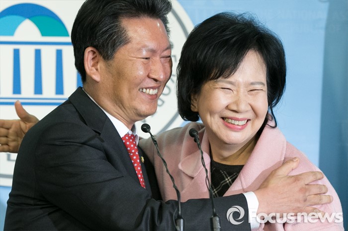 (서울=포커스뉴스) 손혜원(오른쪽) 더불어민주당 홍보위원장이 18일 오후 서울 여의도 국회 정론관에서 출마 기자회견을 마친 뒤, 정청래 의원과 포옹하고 있다. 한편, 손 위원장이 출마하게 될 서울 마포을 지역구는 공천 배제 된 정청래 의원 지역구이다.