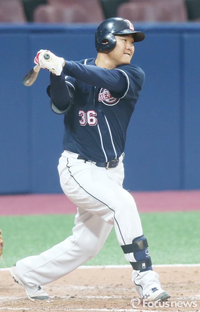 (서울=포커스뉴스) 18일 서울 고척스카이돔에서 열린 2016 프로야구 시범경기 두산-넥센 경기 7회초 두산 오재일이 중견수앞 안타를 때리고 있다.