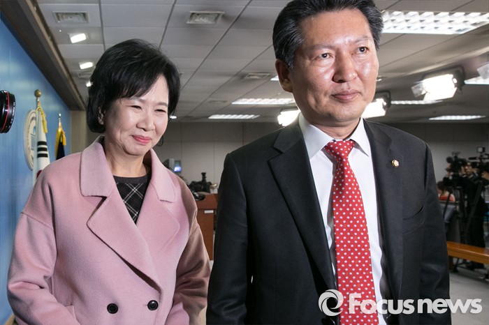 (서울=포커스뉴스) 손혜원(왼쪽) 더불어민주당 홍보위원장이 18일 오후 서울 여의도 국회 정론관에서 출마 기자회견을 마친 뒤, 정청래 의원과 단상을 내려오고 있다. 한편, 손 위원장이 출마하게 될 서울 마포을 지역구는 공천 배제 된 정 의원 지역구이다.