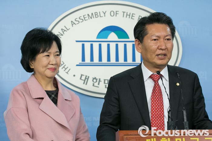 (서울=포커스뉴스) 손혜원(왼쪽) 더불어민주당 홍보위원장이 18일 오후 서울 여의도 국회 정론관에서 출마 기자회견을 마친 뒤, 정청래 의원의 인사말을 경청하고 있다. 한편, 손 위원장이 출마하게 될 서울 마포을 지역구는 공천 배제 된 정 의원 지역구이다.