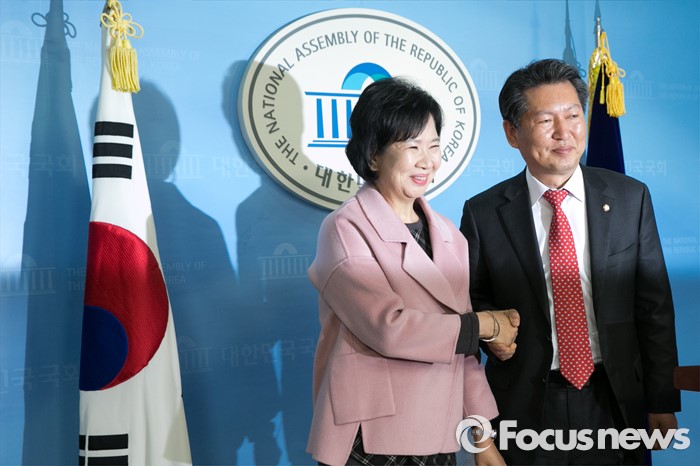 (서울=포커스뉴스) 손혜원(왼쪽) 더불어민주당 홍보위원장이 18일 오후 서울 여의도 국회 정론관에서 출마 기자회견을 마친 뒤, 정청래 의원과 악수하고 있다. 한편, 손 위원장이 출마하게 될 서울 마포을 지역구는 공천 배제 된 정 의원 지역구이다.