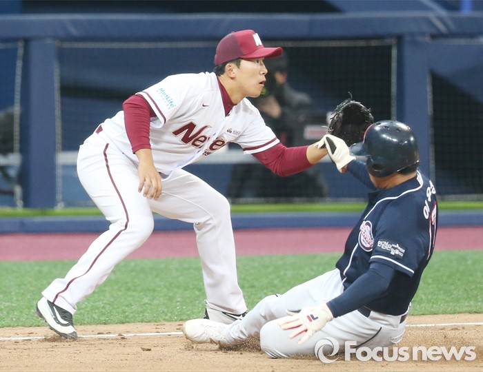 (서울=포커스뉴스) 18일 서울 고척스카이돔에서 열린 2016 프로야구 시범경기 두산-넥센 경기 8회초 1사 2루에서 두산 2루주자 이우성이 조수행의 중견수 플라이 아웃때 3루로 뛰어 세이프되고 있다.