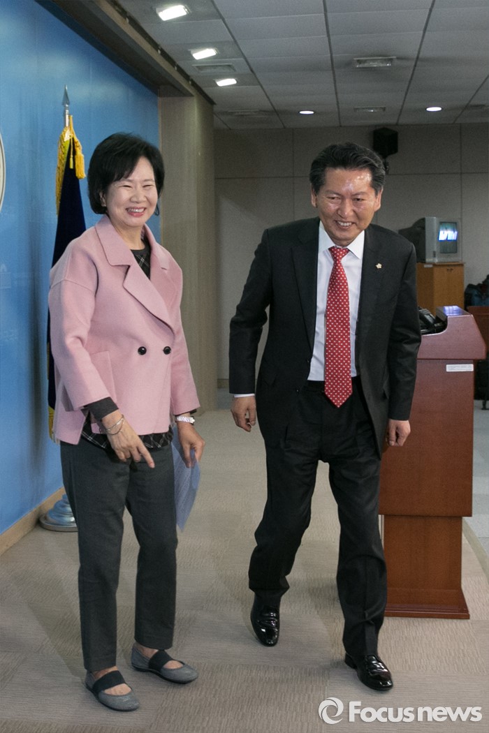 (서울=포커스뉴스) 손혜원(왼쪽) 더불어민주당 홍보위원장이 18일 오후 서울 여의도 국회 정론관에서 출마 기자회견을 마친 뒤, 정청래 의원과 단상을 내려오고 있다. 한편, 손 위원장이 출마하게 될 서울 마포을 지역구는 공천 배제 된 정 의원 지역구이다.
