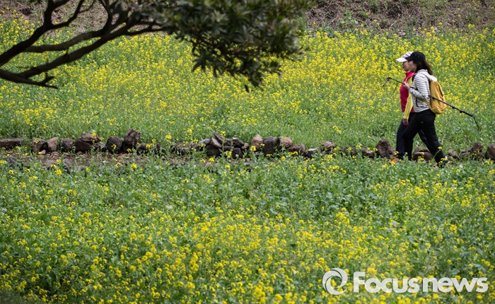 (제주=포커스뉴스)19일 오전 제주 서귀포 중문관광단지 일원에서 제18회 서귀포 유채꽃 국제걷기대회가 열리고 있다. 걷기대회에 참가한 관광객들이 엉덩물계곡 유채꽃길을 걷고 있다.