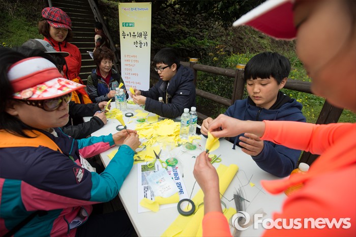 (제주=포커스뉴스)19일 오전 제주 서귀포 중문관광단지 일원에서 제18회 서귀포 유채꽃 국제걷기대회가 열리고 있다. 걷기대회에 참가한 사람들이 종이유채꽃 만들기를 체험하고 있다.