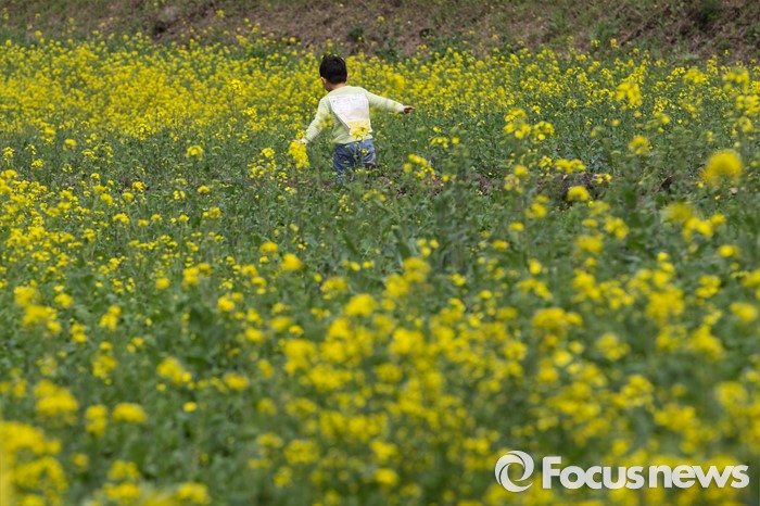 (제주=포커스뉴스)19일 오전 제주 서귀포 중문관광단지 일원에서 제18회 서귀포 유채꽃 국제걷기대회가 열리고 있다. 한 아이가 유채꽃길을 뛰어가고 있다.