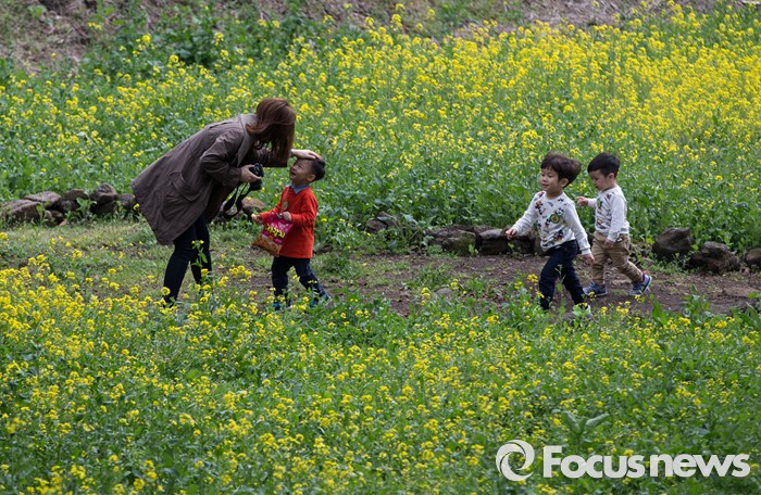 (제주=포커스뉴스)19일 오전 제주 서귀포 중문관광단지 일원에서 제18회 서귀포 유채꽃 국제걷기대회가 열리고 있다. 아이들이 유채꽃길에서 뛰어놀고 있다.