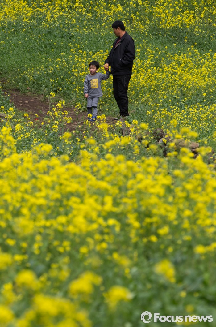 (제주=포커스뉴스)19일 오전 제주 서귀포 중문관광단지 일원에서 제18회 서귀포 유채꽃 국제걷기대회가 열리고 있다. 걷기대회에 참가한 부자가 엉덩물계곡 유채꽃길을 걷고 있다.