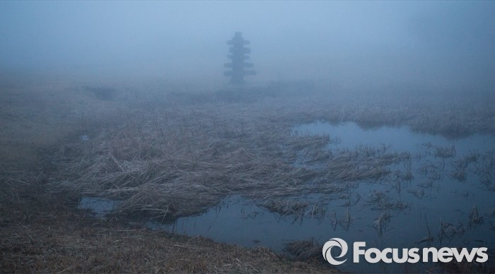 (제주=포커스뉴스) 18일 오후 제주시 남조로 돌문화공원에서 보는 오층돌탑과 안개