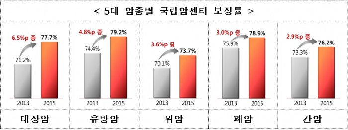 암종별로 국립암센터의 보장률은 2015년 기준 유방암 79.2%, 폐암 78.9%, 대장암 77.7%, 간암 76.2% 순이었다. 이는 2013년에 비해 대장암 6.5%p, 유방암 4.8%p, 위암 3.6%p, 폐암 3.0%p 높아진 수치다.