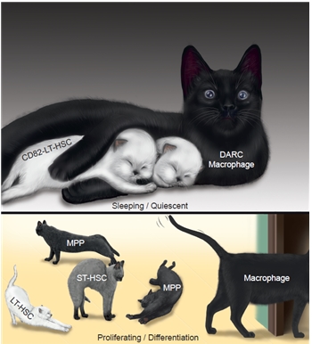 김효수 교수는 “이번 연구성과는 백혈병, 악성빈혈과 같은 골수기능부전증의 치료제를 개발하고, 골수이식의 성공률을 높이는데 활용될 수 있다”고 말했다.[윗 그림: 평상시의 골수상태] 최상위 혈액줄기세포(아기 고양이)인 LT-HSC는 특이하게 카이-원(CD82)단백질을 발현하고 있는데, 이것의 파트너인 다크(DARC) 단백질은 대식세포(어미 고양이)의 표면에 발현한다. 즉 평상시에는 카이-원(CD82)-다크(DARC)의 결합으로 인해서 대식세포가 최상위 혈액줄기세포를 보호해 동면상태에 있도록 배려한다.[아랫 그림 : 골수가 파괴된 후 복구상태] 골수에 독성약물이나 방사선조사에 의해서 골수의 세포들이 전멸하게 되면, 구원세포로서 그동안 동면상태에 있던 최상위 혈액줄기세포의 표면에 카이-원(CD82)이 사라지면서 LT-HSC가 잠에서 깨어나 증식/분화를 시작한다. 그 결과 하위 혈액줄기-전구세포인 ST-HSC, MPP가 태어나고, 그 이하 모든 혈액세포들, 백혈구·적혈구·혈소판 등이 재생하게 된다. <자료출처=보건복지부>
