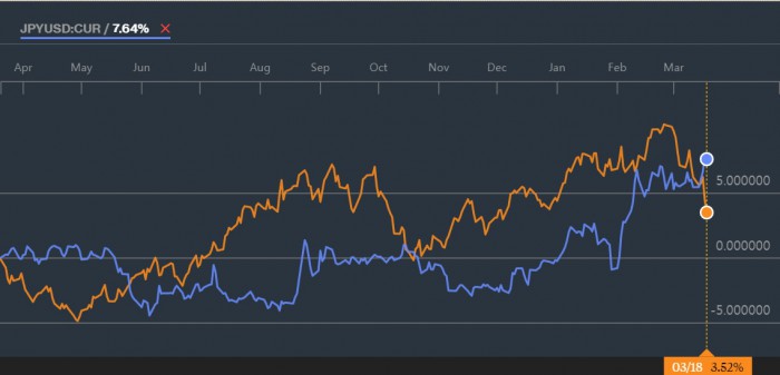 미국 2월 기존주택판매 시장 예상치는 전월 대비 2.9%감소인데, 1월 기존주택판매는 전월 대비 0.4%증가한 바 있다. 시장에서 미 2월 신규주택판매는 1월 감소폭(-9.2%)이 컸던 만큼 기저효과때문에 증가할 것으로 전망하고 있다.최근 1년간 원·달러(주황색 선)환율 움직임과 엔·달러 (파란색 선)환율의 움직임.<자료제공=블룸버그 화면 캡처>