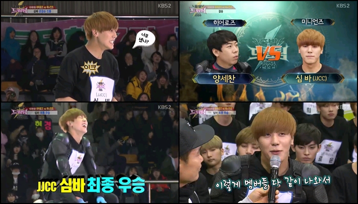 심바는 20일 방송된 KBS 2TV ‘출발드림팀 시즌2-히어로즈 VS 미니언즈’ 편에 출연해 발군의 운동능력과 두뇌회전을 앞세워 최후의 1인에 올랐다. 심바는 리온파이브 민재, 엠티폴 테오, BTL 맥스 등과 펼친 예선을 1위로 통과했다. 이어진 1대 1 대결에서도 히어로즈 팀 프로게이머 이윤열을 제압하고 준결승에 진출했다.