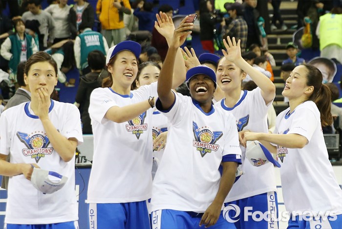 (부천=포커스뉴스) 20일 부천체육관에서 열린 2015-2016 여자프로농구 챔피언결정전 3차전에서 KEB하나은행을 물리치고 3승으로 통합 챔피언을 차지한 우리은행 스트릭렌이 동료들과 셀카를 찍으며 기뻐하고 있다.