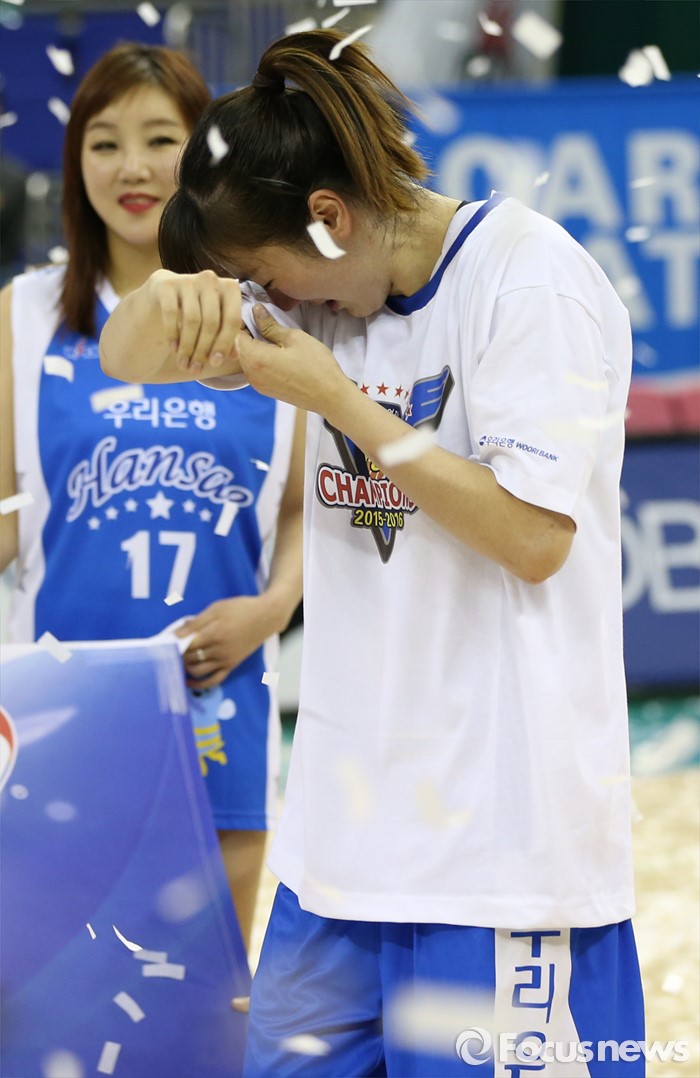 (부천=포커스뉴스) 20일 부천체육관에서 열린 2015-2016 여자프로농구 챔피언결전전에서 MVP를 차지한 박혜진이 감격의 눈물을 흘리고 있다.