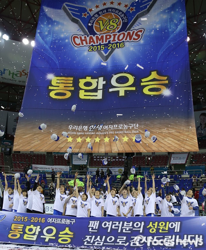 (부천=포커스뉴스) 20일 부천체육관에서 열린 2015-2016 여자프로농구 챔피언결정전 3차전에서 KEB하나은행을 물리치고 3승으로 통합 우승을 차지한 우리은행 선수들이 챔피언 모자를 던지며 환호하고 있다.