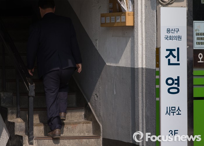 (서울=포커스뉴스) 21일 오전 서울 용산구 진영 의원 지역구 사무실 간판의 정당과 기호 표시가 가려져 있다. 진 의원은 새누리당에서 공첸 배제된 뒤 탈당해 더불어민주당으로 입당했다.