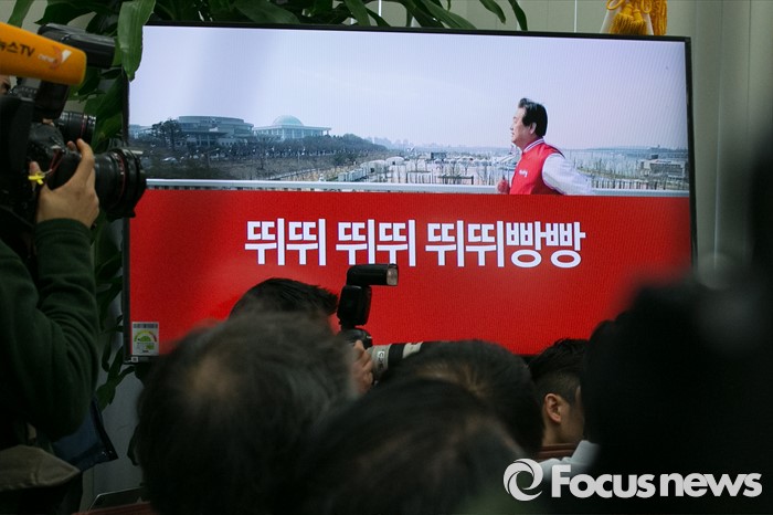 (서울=포커스뉴스) 21일 오전 서울 여의도 국회에서 열린 새누리당 최고위원회의에서 20대 총선 홍보 노래영상이 상영되고 있다.