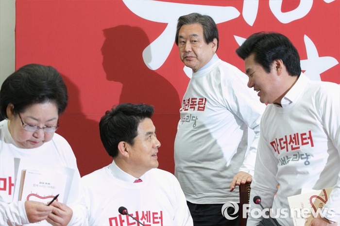 (서울=포커스뉴스) 김무성(오른쪽 두번째) 새누리당 대표가 21일 오전 서울 여의도 국회에서 열린 최고위원회의를 마친 뒤, 비공개 회의실로 향하고 있다.