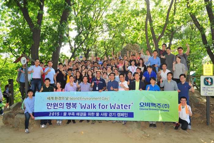 한편, 유엔(UN)은 전세계적으로 물 부족 현상에 대한 경각심과 물의 중요성을 일깨우기 위해 매년 3월22일을 '세계 물의 날'로 지정하고 있다. 올해 주제는 '물과 일자리(Water and Jobs)'다.지난해 '물 사랑 걷기 캠페인'에 참여한 오비맥주 임직원들이 화이팅을 외치고 있다.<사진제공=오비맥주>
