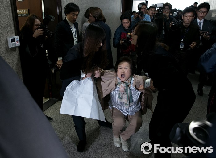 | △ 끌려나가는 더민주 전국실버위원회 여성 당원 |