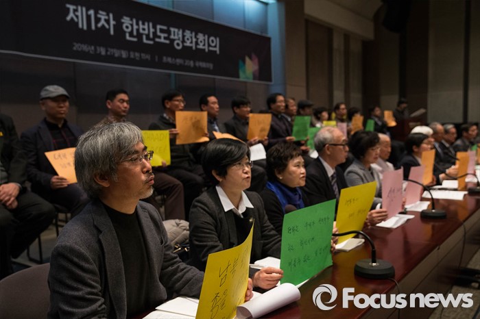 (서울=포커스뉴스) 21일 오전 서울 종로구 프레스센터에서 열린 제1차 '한반도 평화 회의'에 참석자들이 한반도 평화를 촉구하며 피켓 퍼포먼스를 하고 있다.