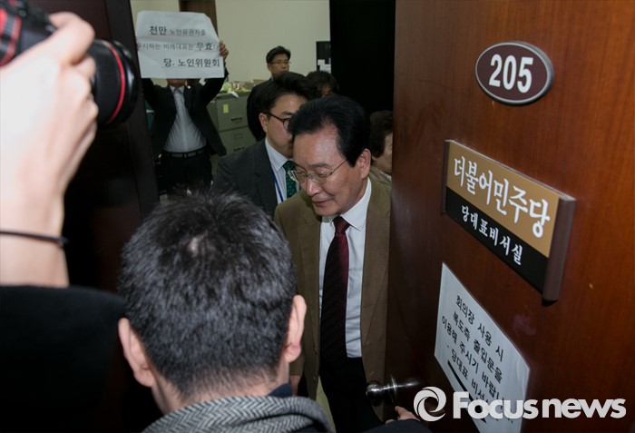 (서울=포커스뉴스) 21일 오전 서울 여의도 국회 더불어민주당 비대위 대표회의실에서 변재일 비대위원이 비례대표 후보 공천 등에 항의하고 있는 전국실버위원회 당원들과 대화 중 회의실을 나서고 있다.