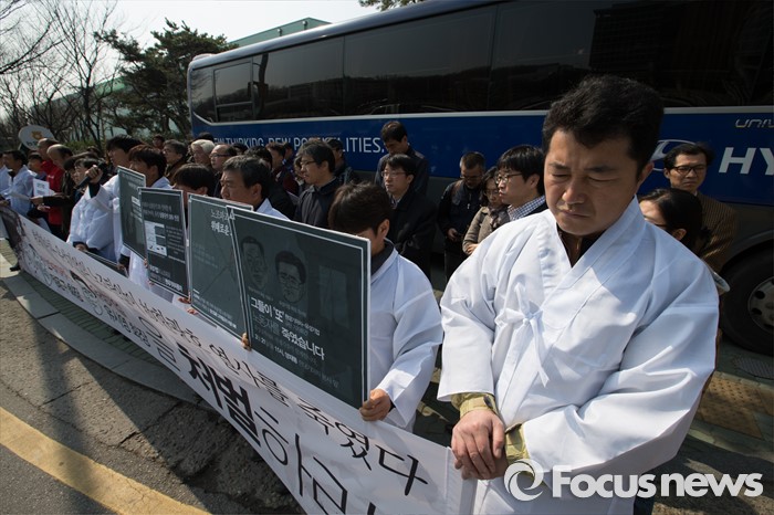 (서울=포커스뉴스) 21일 오전 서울 서초구 현대자동차 본사에서 유성기업 공대위와 시민사회단체 회원들이 유성기업 故 한광호 사망 현대자동차 규탄 기자회견을 하고 있다.
