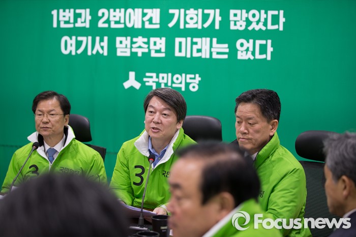 (서울=포커스뉴스) 안철수 국민의당 상임공동대표가 21일 오전 서울 여의도 국회 의원회관에서 열린 최고위원회의에서 모두발언을 하고 있다. 왼쪽부터 천정배 상임공동대표, 안 대표, 주승용 원내대표.