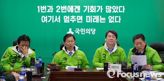 (서울=포커스뉴스) 안철수, 천정배 국민의당 상임공동대표를 비롯한 집행부가 21일 오전 서울 여의도 국회 의원회관에서 열린 최고위원회의에 참석하고 있다. 오른쪽 부터 주승용 원내대표, 안 대표, 천정배 상임공동대표, 김영환 선대위원장