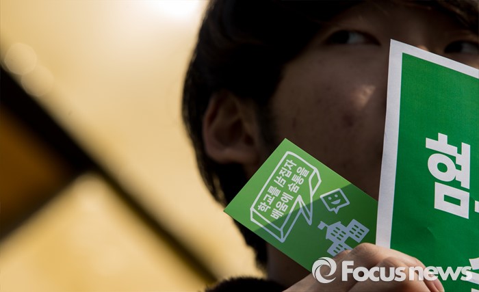 (서울=포커스뉴스) 21일 오전 서울 광화문 광장에서 열린 녹색당 교육(배움) 공약 발표 기자회견에 참석한 학생이 '학교를 뒤집자, 배움에 숨통을'이 적힌 소형 손팻말을 들고 있다.