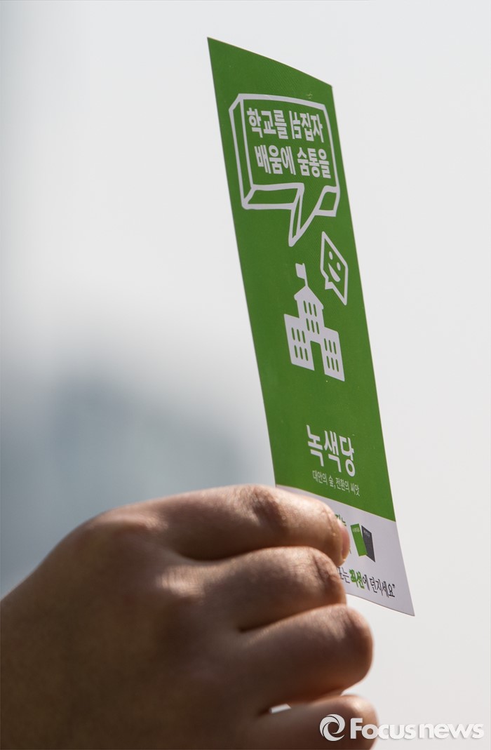 (서울=포커스뉴스) 21일 오전 서울 광화문 광장에서 열린 녹색당 교육(배움) 공약 발표 기자회견에 참석한 학생이 '학교를 뒤집자, 배움에 숨통을'이 적힌 소형 손팻말을 들고 있다.