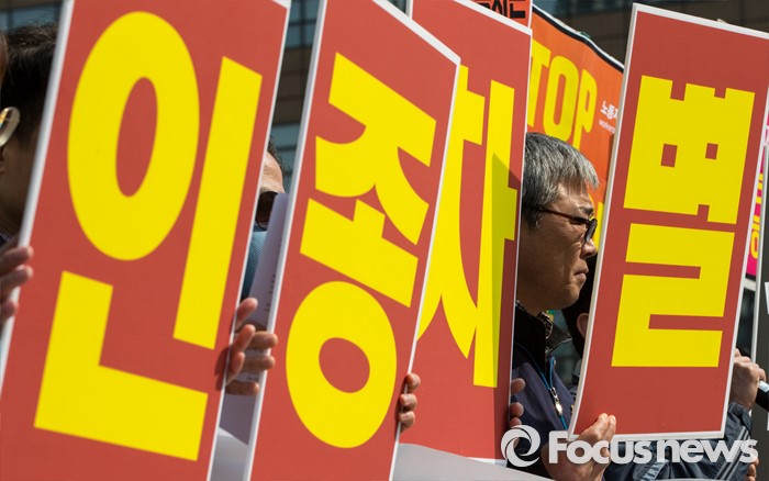 (서울=포커스뉴스) 21일 오전 서울 광화문 광장에서 열린 '세계인종차별철폐의 날 맞이 제 이주 인권 노동 사회단체 국제연대 공동 기자회견'에 참석한 김종인 민주노총 부위원장이 인종차별에 반대하는 손팻말을 들고 있다.