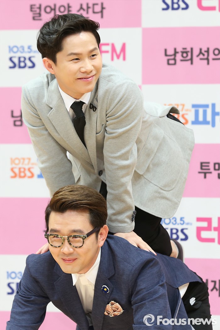 (서울-포커스뉴스) 21일 오후 서울 SBS 목동사옥에서 열린 SBS 라디오 봄 개편 기자간담회에 참석한 개그맨 양세형(위쪽)과 윤형빈이 포토타임을 갖고 있다.