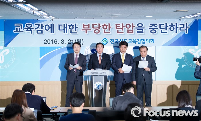 (서울=포커스뉴스) 21일 오후 서울특별시교육청에서 전국시도교육감협의회가 교육감 탄압 중단 성명서를 발표하고 있다. 왼쪽부터 조희연 서울교육감, 민병희 강원교육감, 이청연 인천교육감, 장휘국 광주교육감.
