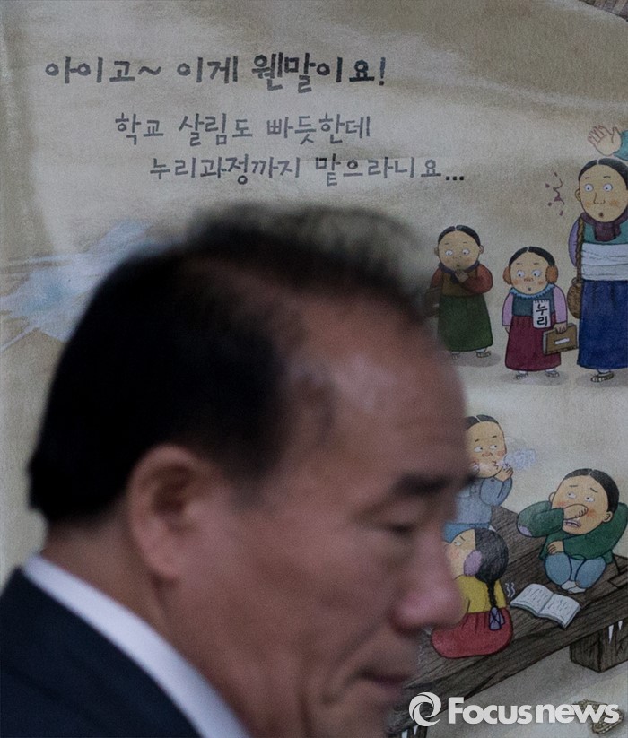 (서울=포커스뉴스) 21일 오후 서울특별시교육청에서 장휘국 전국시도교육감협의회 회장이 교육감 탄압 중단 성명서를 발표하기 위해 기자회견장으로 들어서고 있다.