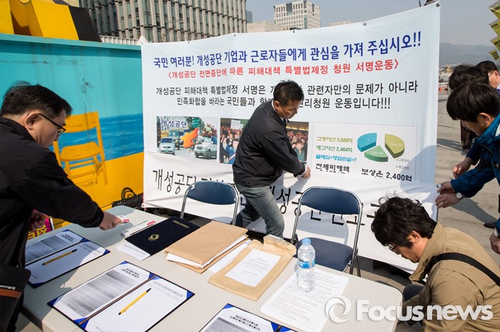 (서울=포커스뉴스) 21일 오전 서울 광화문 광장에서 개성공단 근로자 협의회 관계자들이 피해대책 특별법제정 청원 서명운동 본부를 설치하고 있다.