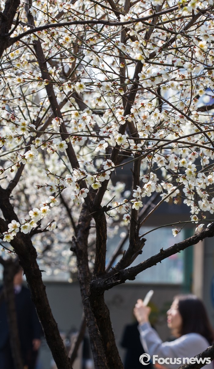 (서울=포커스뉴스) 봄 기운이 완연한 21일 오후 서울 종로구 탑골공원 인근에서 시민들이 봄볕을 머금고 만개한 매화를 촬영하고 있다.