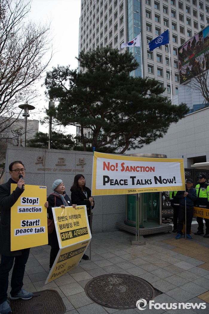 (서울=포커스뉴스) 21일 오후 정부서울청사 별관앞에서 '평화와 통일을 여는 사람들'(평통사) 회원들이 한미 양국의 강경 대북제재에 반대하며 집회를 열고 있다.