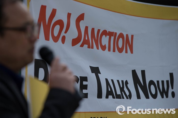 (서울=포커스뉴스) 21일 오후 정부서울청사 별관앞에서 '평화와 통일을 여는 사람들'(평통사) 회원들이 한미 양국의 강경 대북제재에 반대하며 집회를 열고 있다.