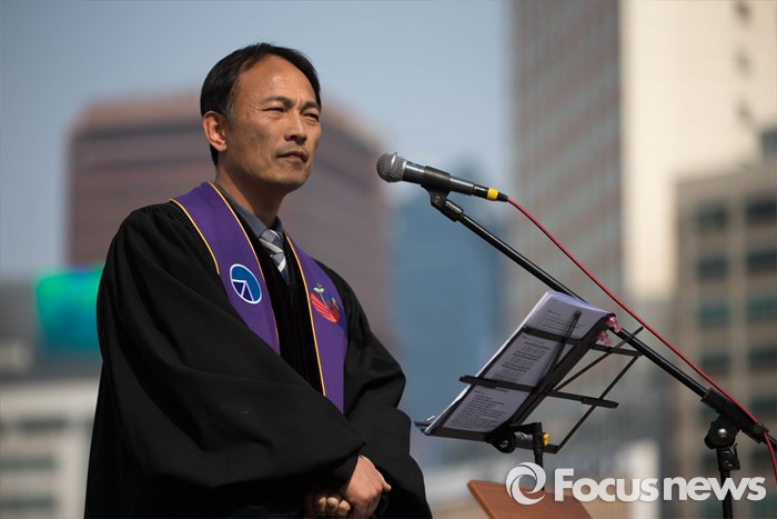 (서울=포커스뉴스) 21일 오후 서울 중구 덕수궁 대한문 앞에서 한국기독교 장로회 총회 '고난당하는 민주주의를 위한 시국기도회'가 열리고 있다.