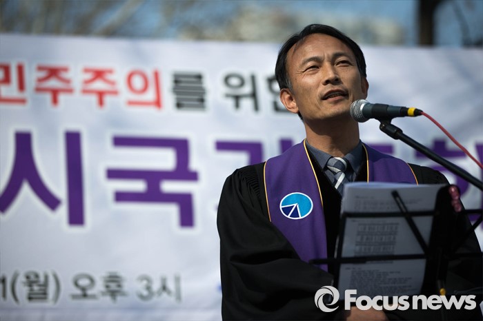 (서울=포커스뉴스) 21일 오후 서울 중구 덕수궁 대한문 앞에서 한국기독교 장로회 총회 '고난당하는 민주주의를 위한 시국기도회'가 열리고 있다.