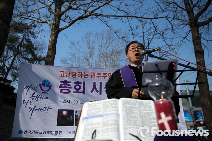(서울=포커스뉴스) 21일 오후 서울 중구 덕수궁 대한문 앞에서 한국기독교 장로회 총회 '고난당하는 민주주의를 위한 시국기도회'가 열리고 있다.