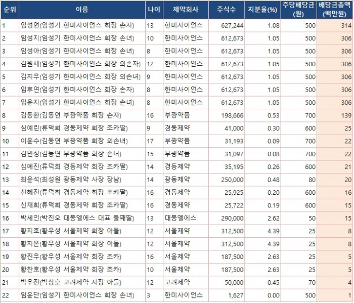 한편 주요 상장제약사의 가장 어린 주주는 한미사이언스의 임윤단 양(3세)이었다. 한미사이언스 주식 1627주를 보유 중인 임양의 올해 배당금총액은 81만3500원을 기록했다.상장제약사 미성년자 주식부호 배당금총액 순위(1998년생 이하 미성년자 기준) <자료출처=팜스코어>