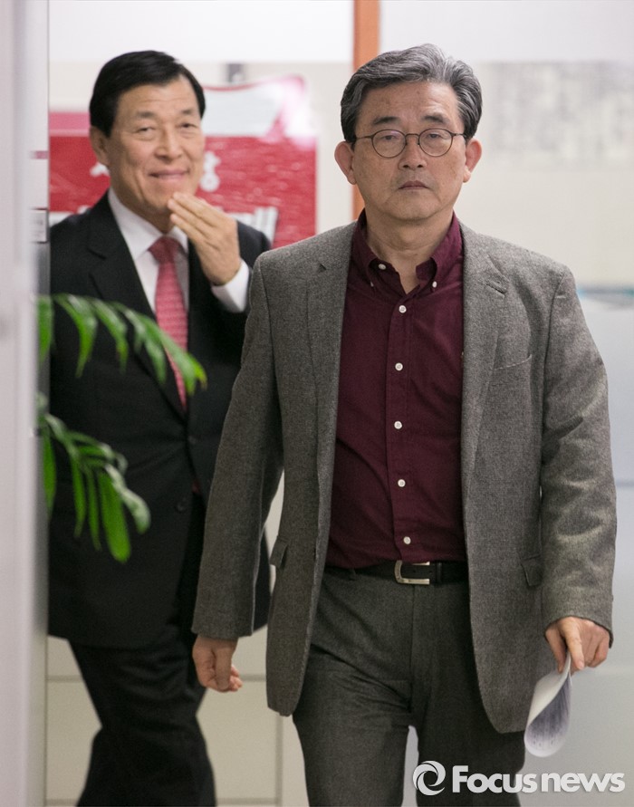 (서울=포커스뉴스) 이한구(오른쪽) 새누리당 공천관리위원장과 황진하 부위원장이 21일 오후 서울 여의도 당사에서 20대 총선 여론조사 경선 결과 발표를 위해 입장하고 있다.
