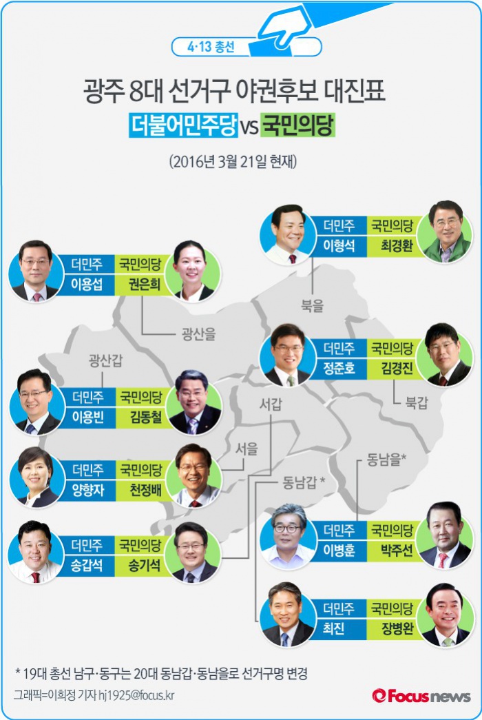 (서울=포커스뉴스) 21일 국민의당이 '야권의 심장'이라 불리는 광주 지역 후보자를 확정함에 따라 더불어민주당과 국민의당이 대진표가 확정됐다. 광주 내 지역구 8곳 중에서 가장 뜨거운 대결이 펼쳐질 지역구는 더민주의 양향자 후보와 국민의당의 천정배 공동대표가 맞붙는 광주 서을이다.