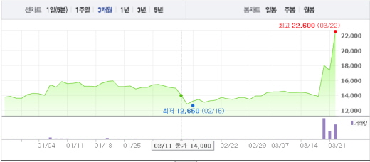 22일 오전 10시4분 현재 녹십자엠에스는 전일대비 무려 29.89%(5200원) 오른 2만2600원에 거래되고 있다.
