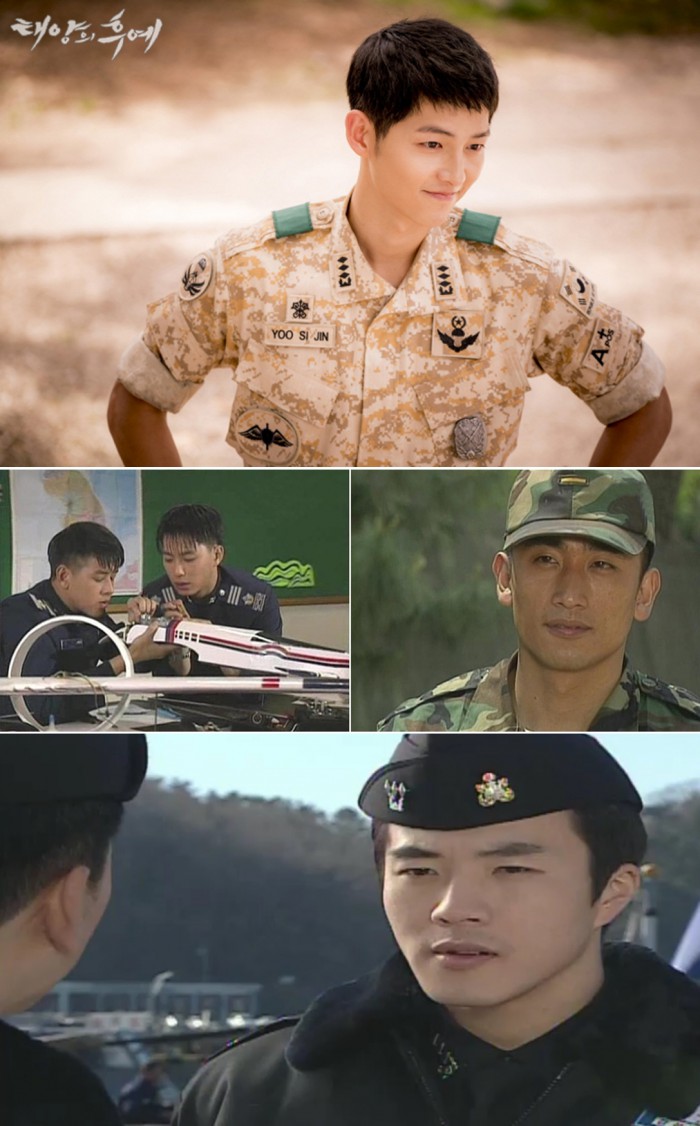 문화평론가 황예림 작가는 "그동안 드라마에서 카리스마 넘치는 군인 캐릭터를 볼 수 있었다면, 유시진은 특전사다운 포스 가운데서 좋아하는 여성에게 올인하는 캐릭터다. '유시진 대위 같은 군인이 실제로 존재할까'하는 의문이 들 만큼 시청자의 마음을 사로잡고 있다"고 밝혔다.KBS2 '태양의 후예' 속 특전사 '유시진(송중기 분)' 캐릭터에 대한 인기가 뜨겁다. '상남자' 캐릭터에 부드러움을 더해 여성 시청자의 사랑을 받고 있다. 반면 1990년대 방송된 군대 드라마 속 캐릭터들은 카리스마 넘치고 남자 다운 면모를 보여왔다. 사진은 드라마 스틸 모음. KBS '태양의 후예' 송중기, KBS2 '신고합시다' 차인표, SBS '태양속으로' 권상우, KBS2 드라마 '창공'의 류시원, 김원준(좌측부터 시계방향). <사진제공=KBS, SBS>