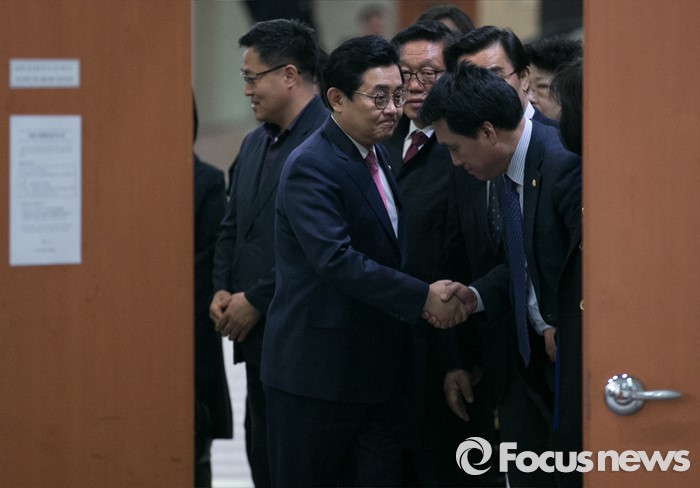 (서울=포커스뉴스) 20대 총선을 앞두고 공천 배제(컷오프)된 전병헌 더불어민주당 의원이 22일 오전 서울 여의도 국회 정론관에서 대선승리를 위한 백의종군 선언 기자회견에 참석하며 지지자들과 악수하고 있다.